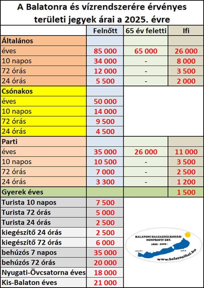 A balatoni területi engedélyek ára változatlan (mellékelt táblázat). |